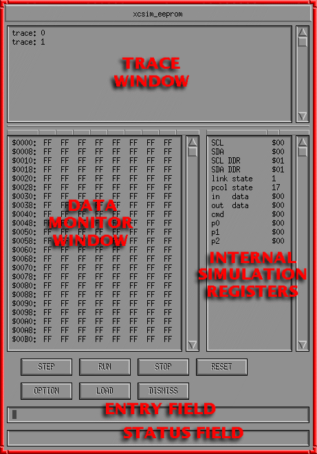 Click on any of the red labels or dialog buttons to see a description of that section of the EEPROM simulator dialog